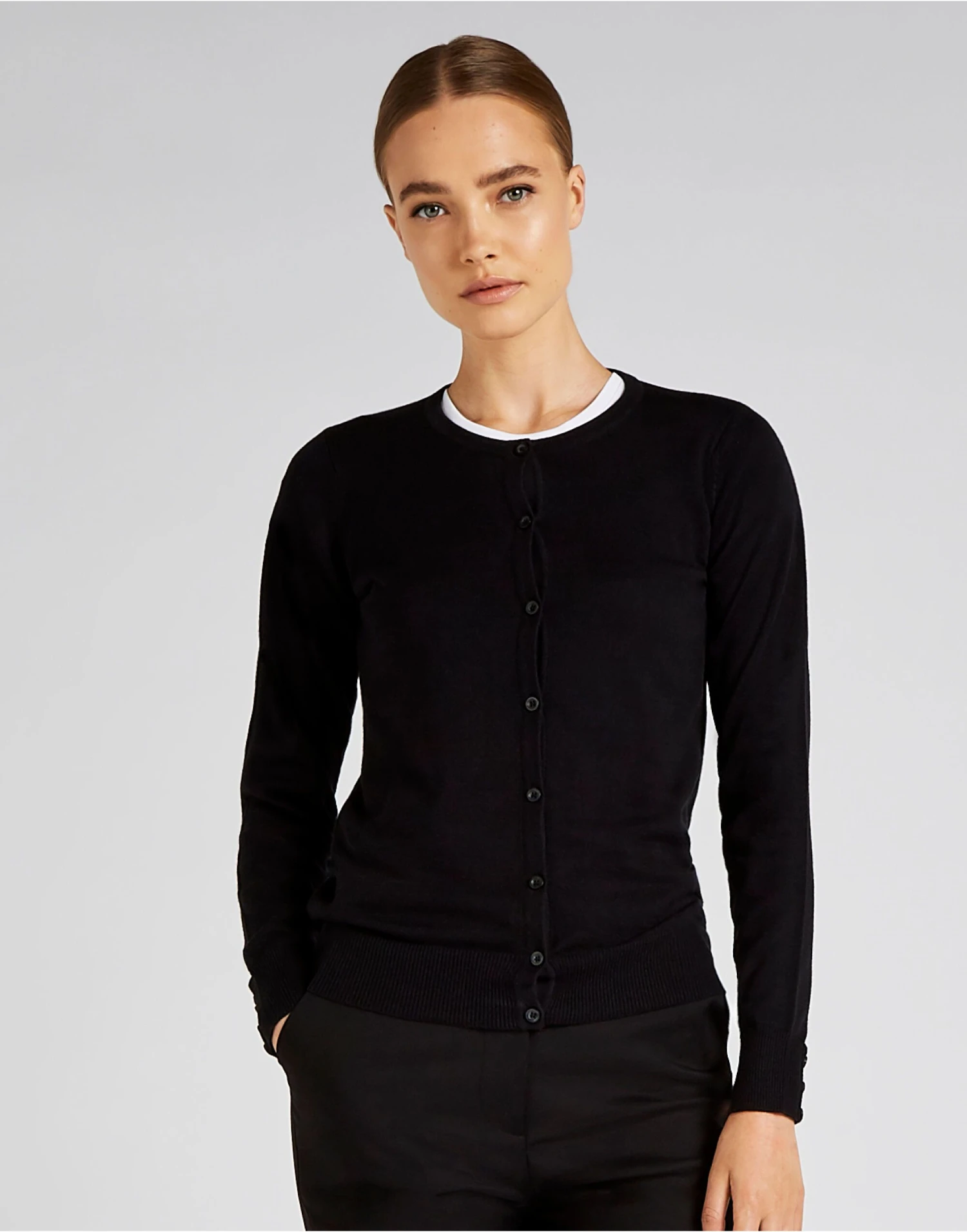 Womens style Tubular linked 8 button stole and neck trim 1×1 rib cuffs and welt Mock placket and button detail on cuffs Fashioned armhole and sleevehead Reinforced shoulder seams Cup seamed underarms, sleeves and side seams Kustom Kit® woven Back neck label