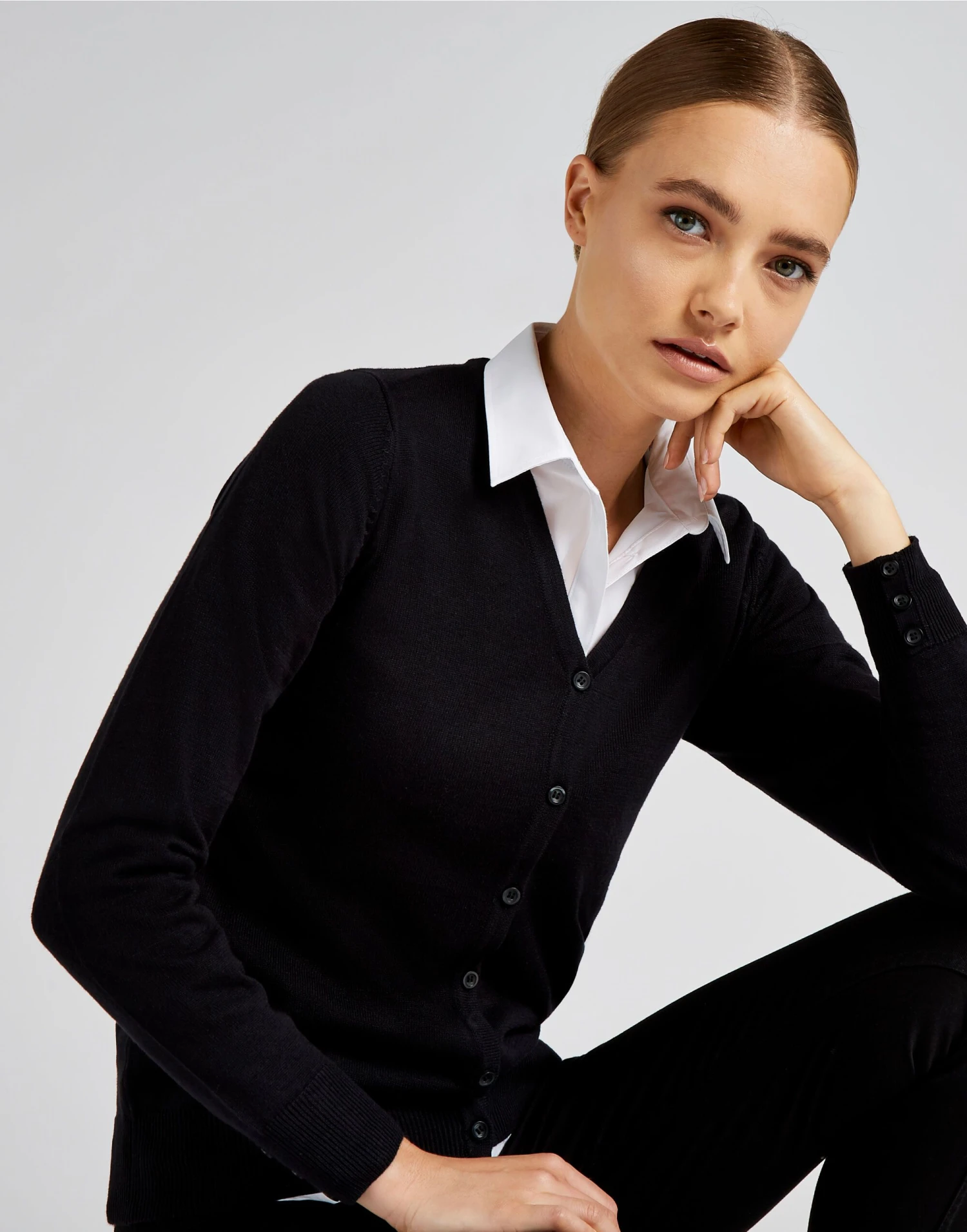 Womens style Tubular linked stole and neck trim 1×1 rib cuffs and welt 7 button stole Mock placket on cuffs Fashioned armhole and sleevehead Reinforced shoulder seams Cup seamed underarm, sleeve and side seams Kustom Kit® woven Back neck label