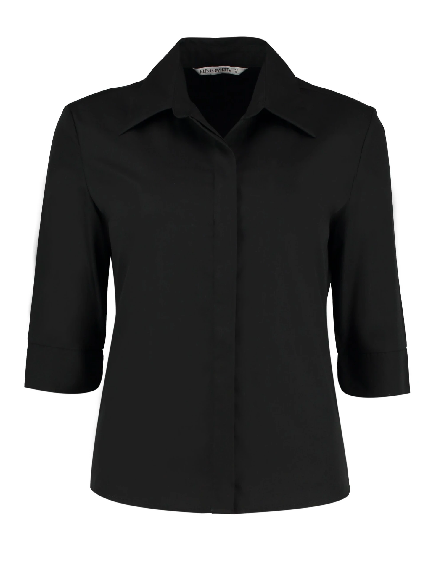 Womens style Soft interlined fused stand up collar Covered front placket Rounded hem Side vents Rounded cuff with vent Centre back seam Spare button 3/4 length sleeves Easy iron Kustom Kit® woven back neck label