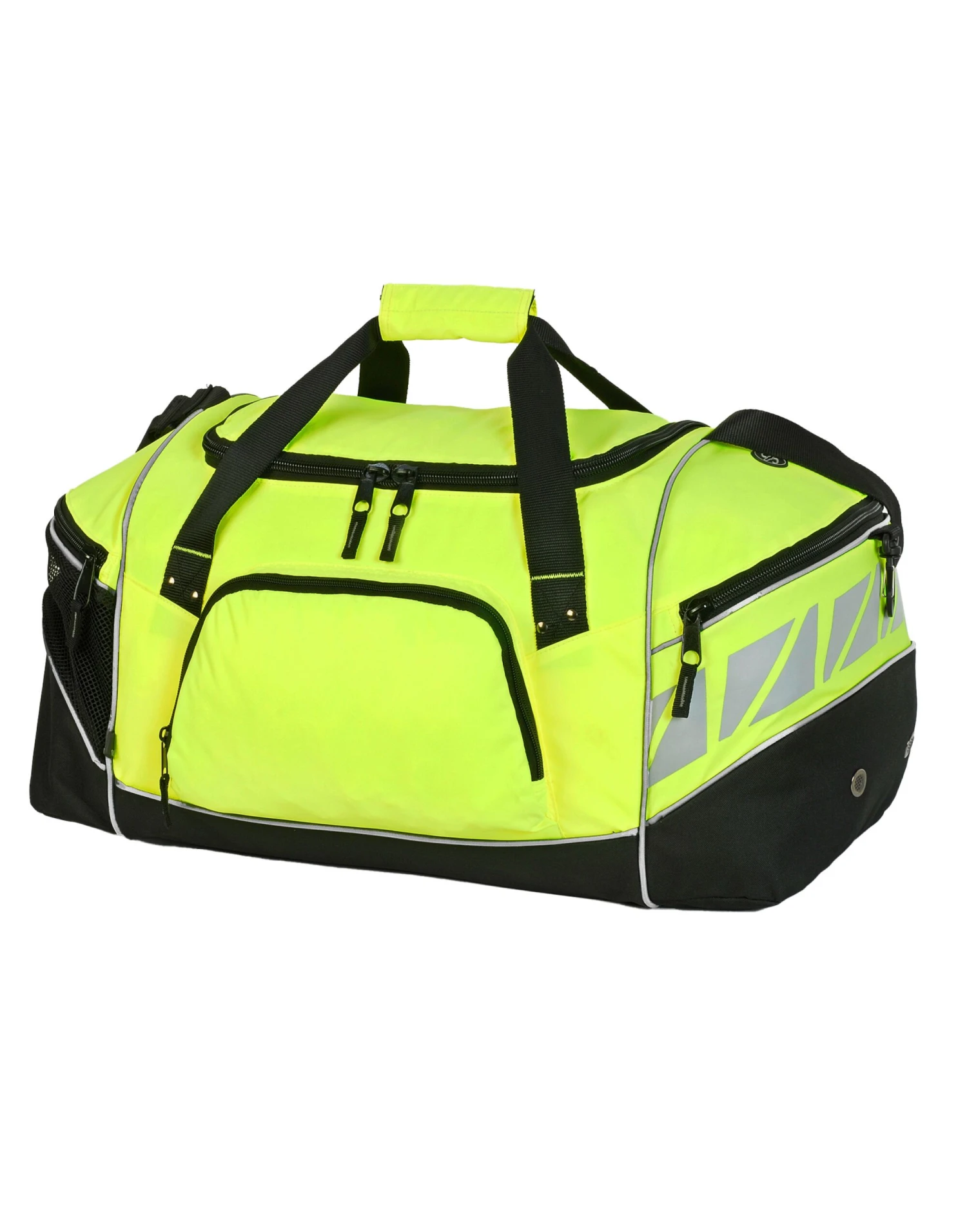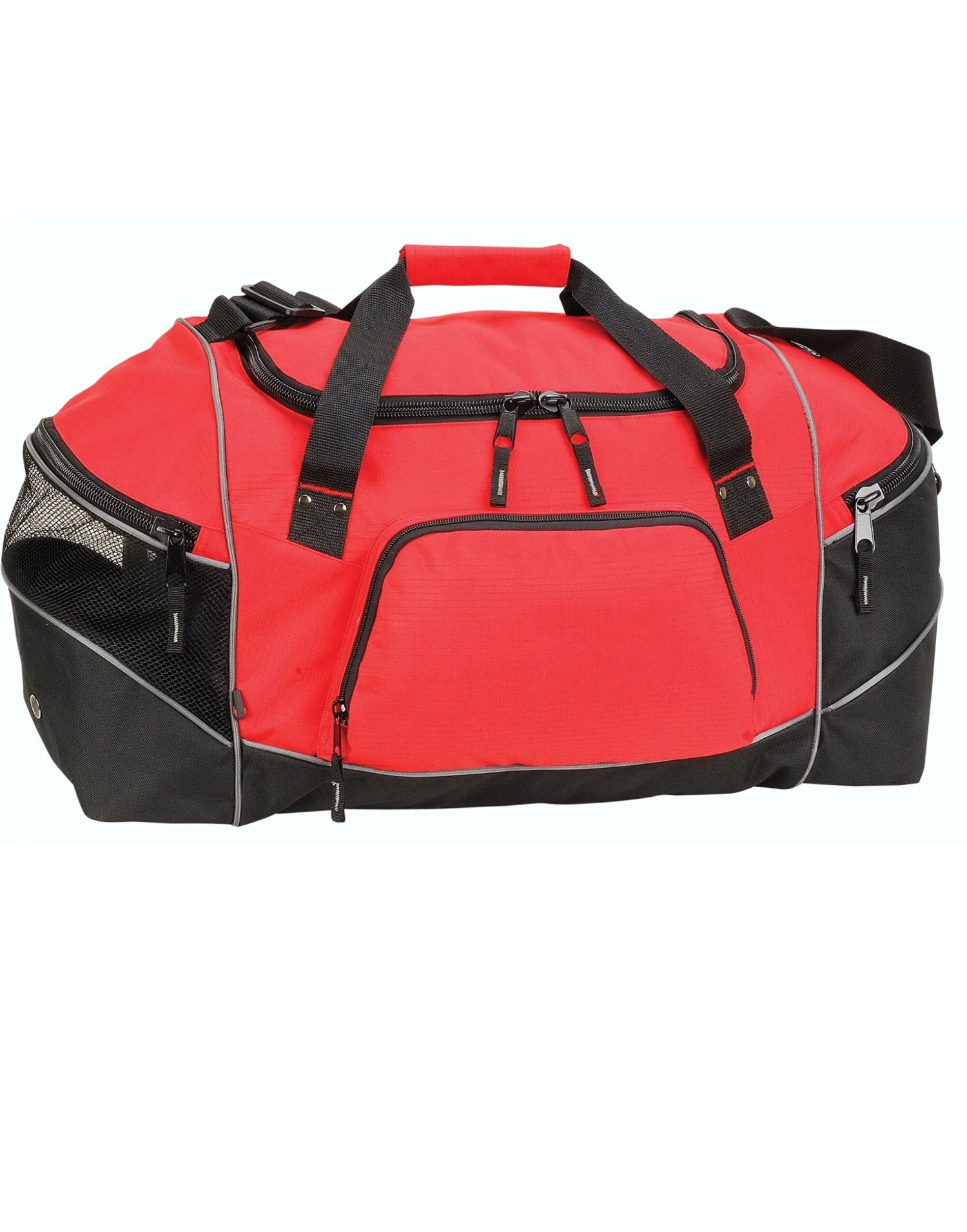 Practical sports / overnight holdall MP3 / iPodâ„¢ outlet One main compartment Internal base board Two side pockets, one with mesh for ventilation Front pocket for easy decoration Reinforced webbed adjustable shoulder strap Reinforced webbed carrying handles with polyester / hook and loop wrap Dimensions: 31H x 60W x 27D cm Maximum print area: 11 x 19cm front, 18 x 26cm top Capacity: 46 litres Suitable for screen printing, transfer printing or embroidery